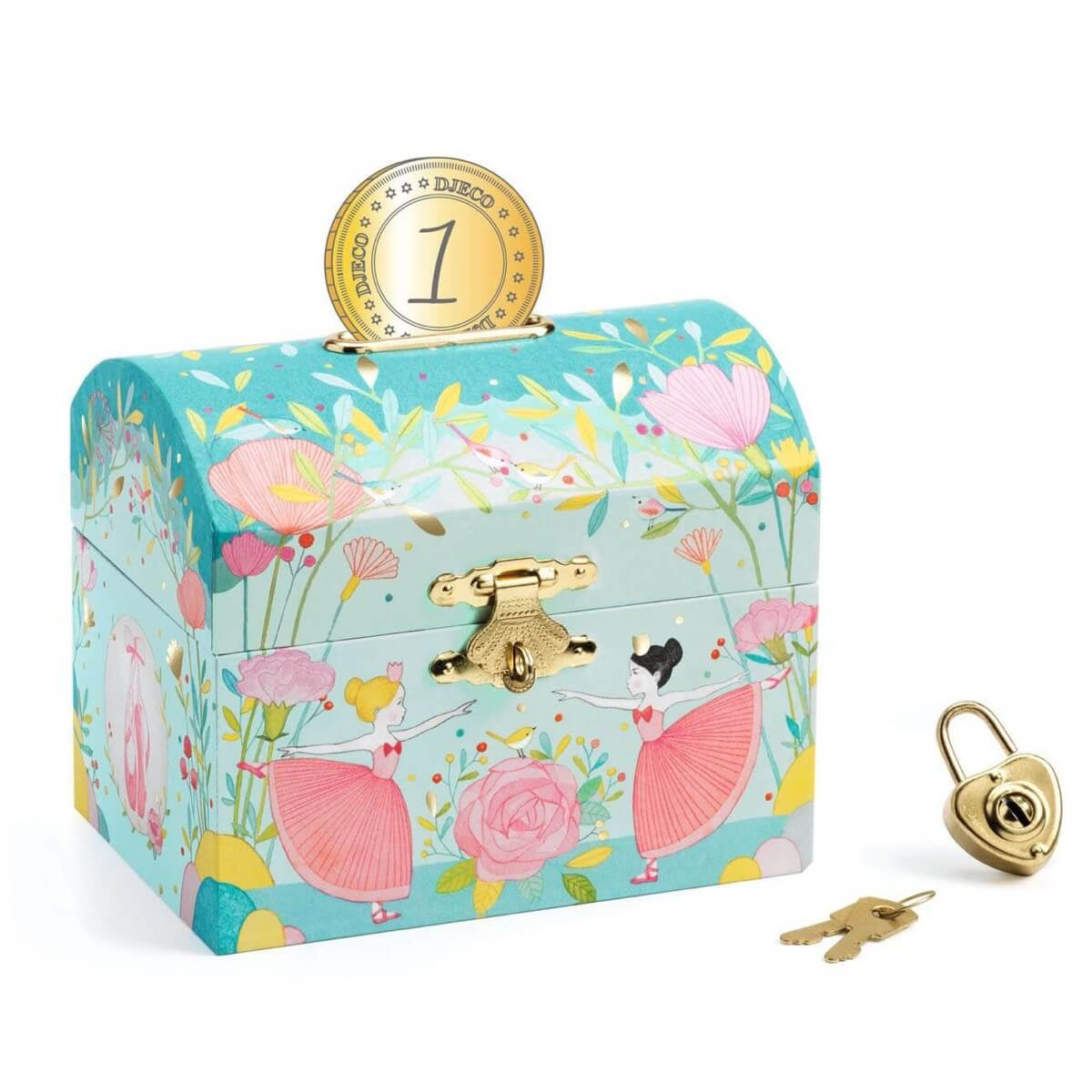 Discover the charming Ballerina piggy bank from Djeco, which can also be used as a treasure chest.