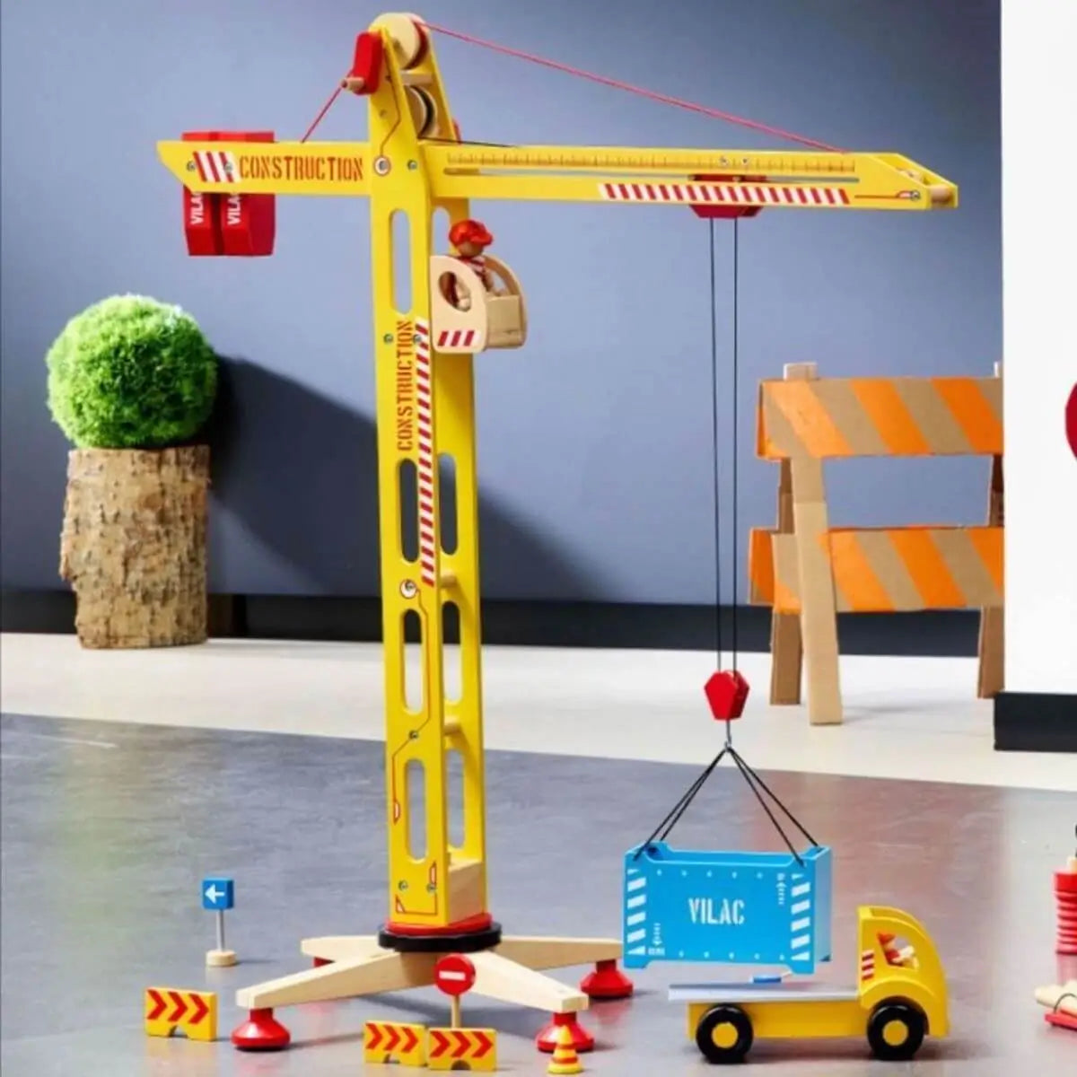 This large wooden crane from Vilac includes 12 pieces, including workers, loads, safety signs and magnetic fasteners for use with the Vilacity container carrier or transport truck.
