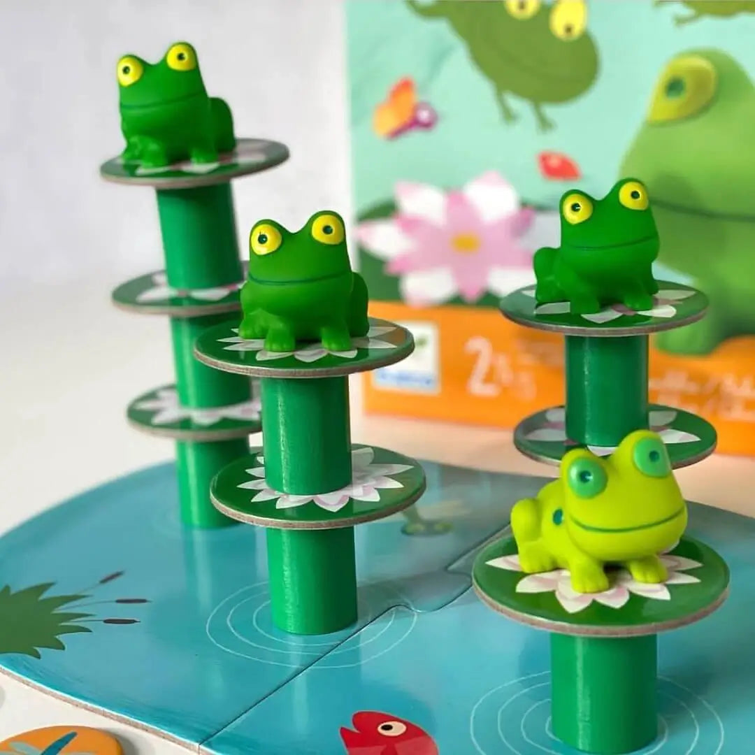Aim of the game: balance the water lilies on the stilts, then the frogs on top of this precarious balance.