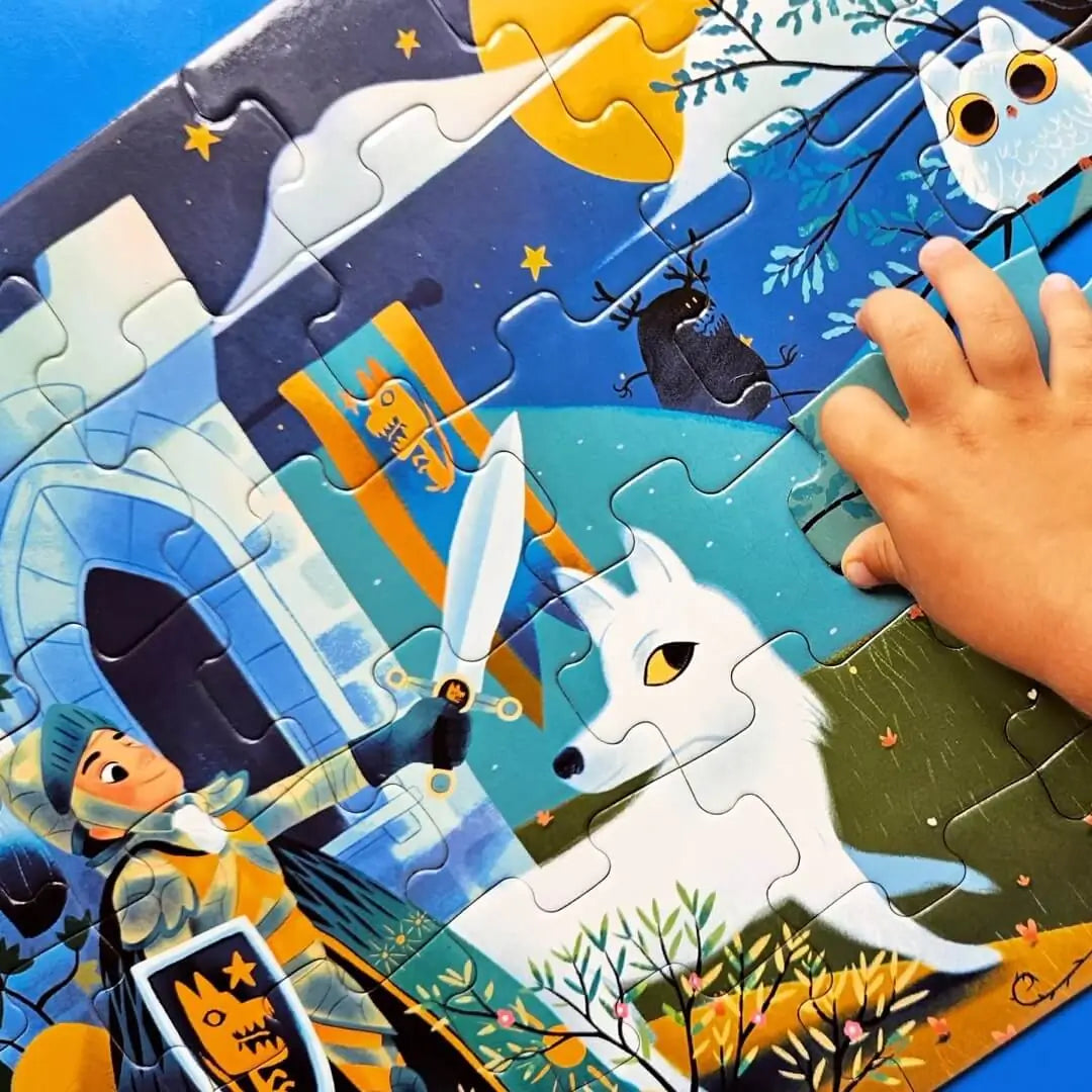 Discover the Knight of the Full Moon puzzle from Djeco, a magnificent 36-piece cardboard puzzle for children aged 4 and over. A very beautiful illustration of a knight accompanied by a wolf in front of a fortified castle in the moonlight.