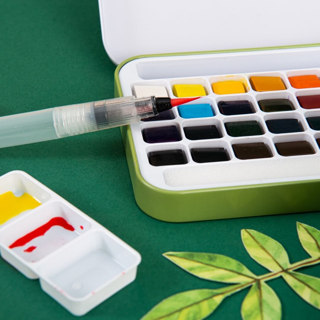 - 24 watercolor shades in their illustrated metal box with a magic brush with water reservoir and a sponge