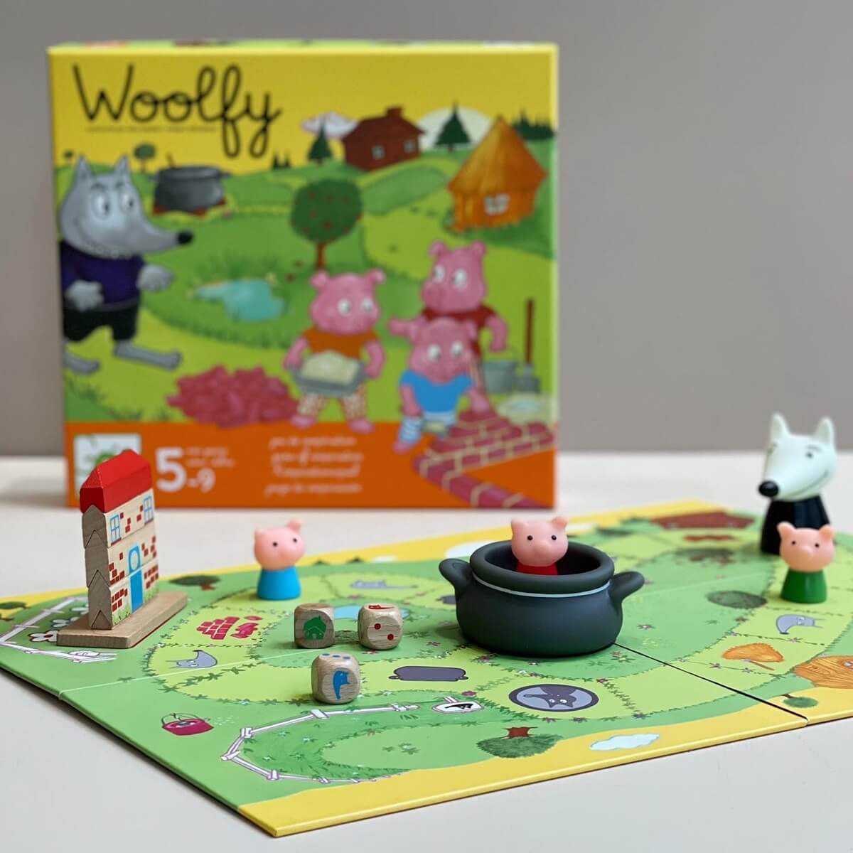 Game board, 4 figurines (3 pigs and 1 big bad wolf), 1 soft plastic pot, 3 wooden cubes and 1 brick house in 5 parts to build, rules of the game in several languages