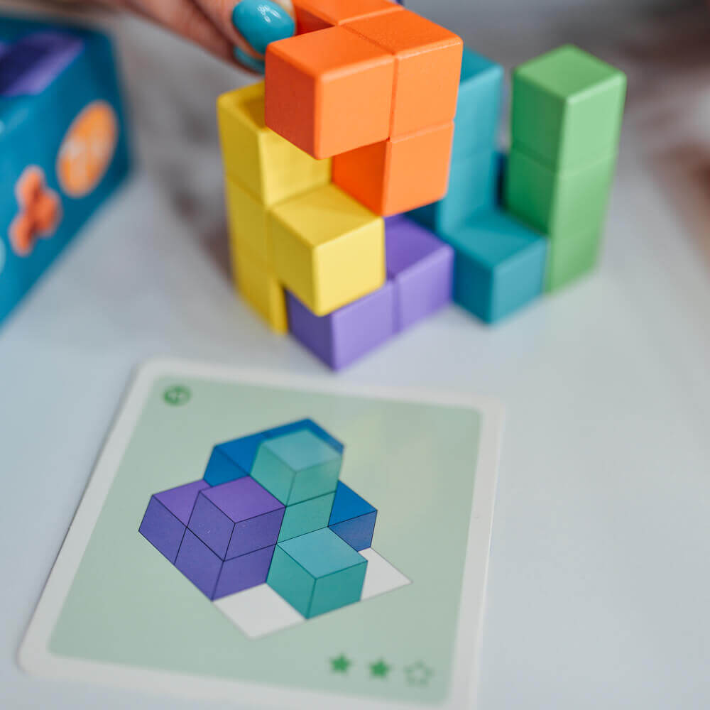 Prenez une carte parmi les 30 défis proposés, positionnez les premières pièces comme demandé et faîtes chauffer vos méninges. Essayez maintenant de placer les autres pièces de manière à créer un cube parfait.