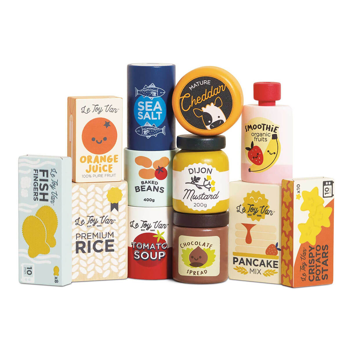 Ce charmant ensemble de 12 pièces est parfait pour que vos petits acheteurs puissent remplir leurs chariots, réfrigérateurs ou garde-manger.