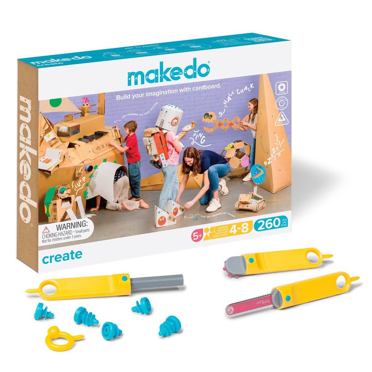 Les kits d'outils de construction en carton Makedo sont livrés avec tous les outils dont vous avez besoin pour inventer, fabriquer et jouer avec du carton recyclé. Fabriquez des forts, des voitures, des costumes, des jeux en carton et organisez des activités amusantes et engageantes pour vos enfants.