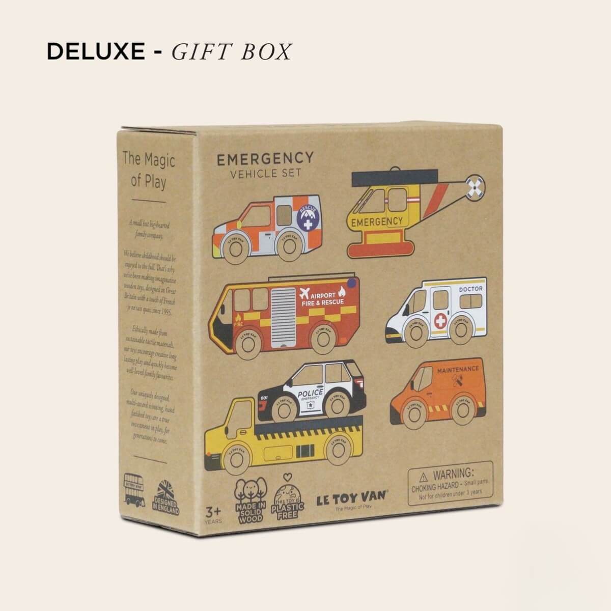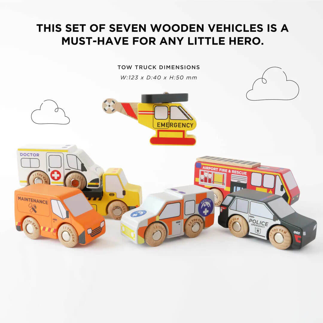 Ce coffret de 7 véhicules d'urgence en bois est indispensable pour le jeu de mini monde de tout petit héros. Fabriqués avec des roues de haute qualité, ces véhicules sont conçus pour rouler à toute vitesse au sol ou sur des rails de train en bois, pour des heures de jeu imaginatif.